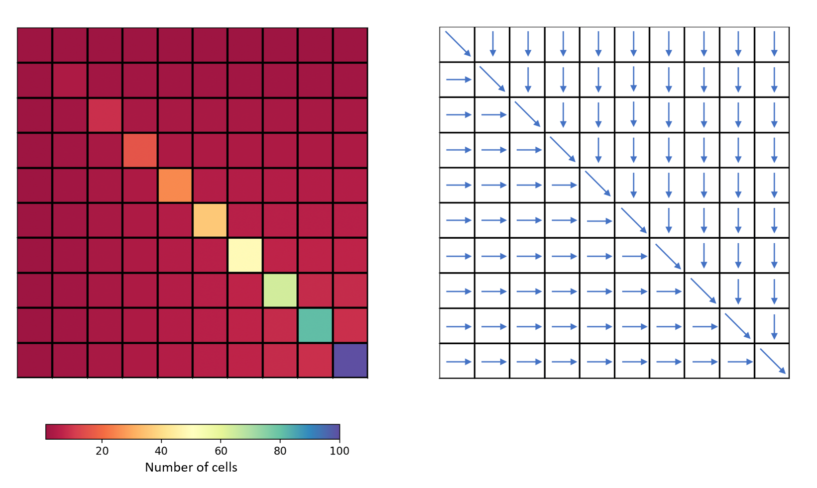 For this case, a fictitious square-shaped catchment of size 10 x 10 km² will be created with the following flow accumulation and flow directions: