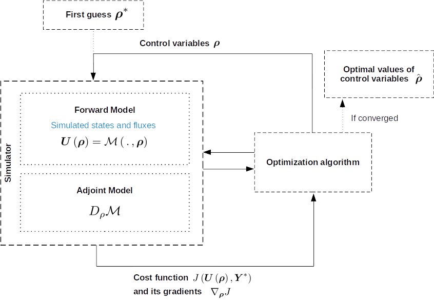 This problem can be tackled with optimization algorithms adapted to high dimensional problems (L-BFGS-B [Zhu et al., 1994] or machine learning optimizers (e.g., Adam [Kingma and Ba, 2014])) that require the gradient \(\nabla_{\boldsymbol{\rho}}J\) of the cost function to the sought parameters \(\boldsymbol{\rho}\). The computation of the cost gradient \(\nabla_{\boldsymbol{\rho}}J\) relies on the composed adjoint model \(D_{\boldsymbol{\rho}}\mathcal{M}\) that is derived by automatic differenciation of the forward model, using the Tapenade software [Hascoet and Pascual, 2013]. The optimization is started from a first guess \(\boldsymbol{\rho}^*\) on the sought parameters \(\boldsymbol{\rho}\).