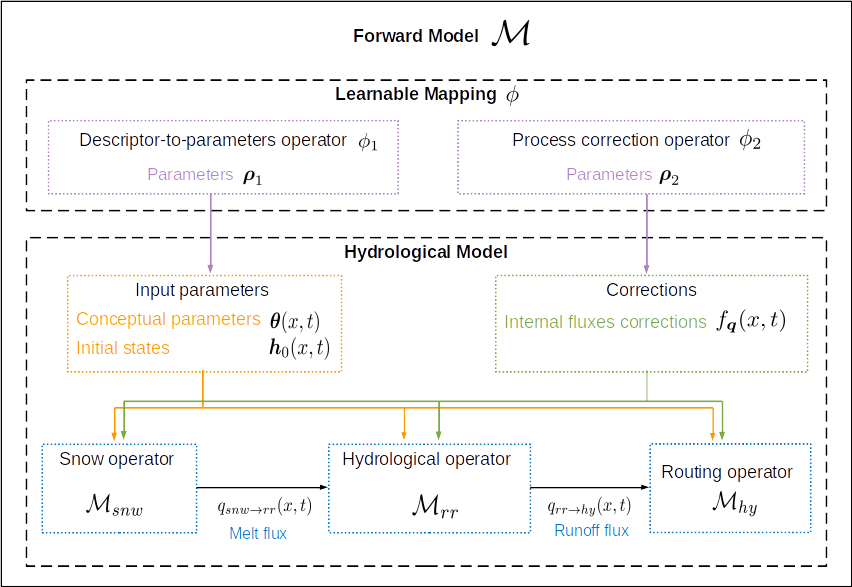 A learnable mapping \(\phi\), composed of neural networks, can also be included into the forward model to predict parameters and/or fluxes corrections from various input data.