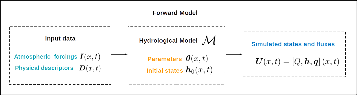 Flowchart of the forward modeling problem: input data, forward hydrological model \(\mathcal{M}\), simulated quantites.#